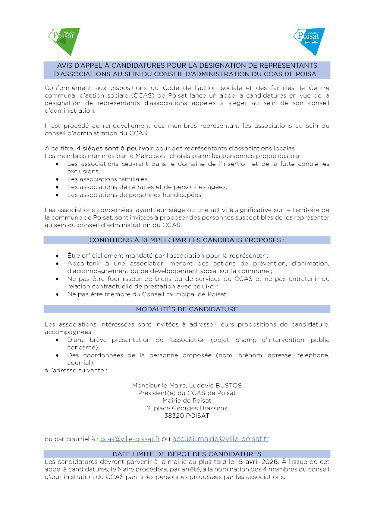 Retour CCAS – Appel à candidature pour le conseil d’administration – Dépôt des candidatures jusqu’au 15 avril
