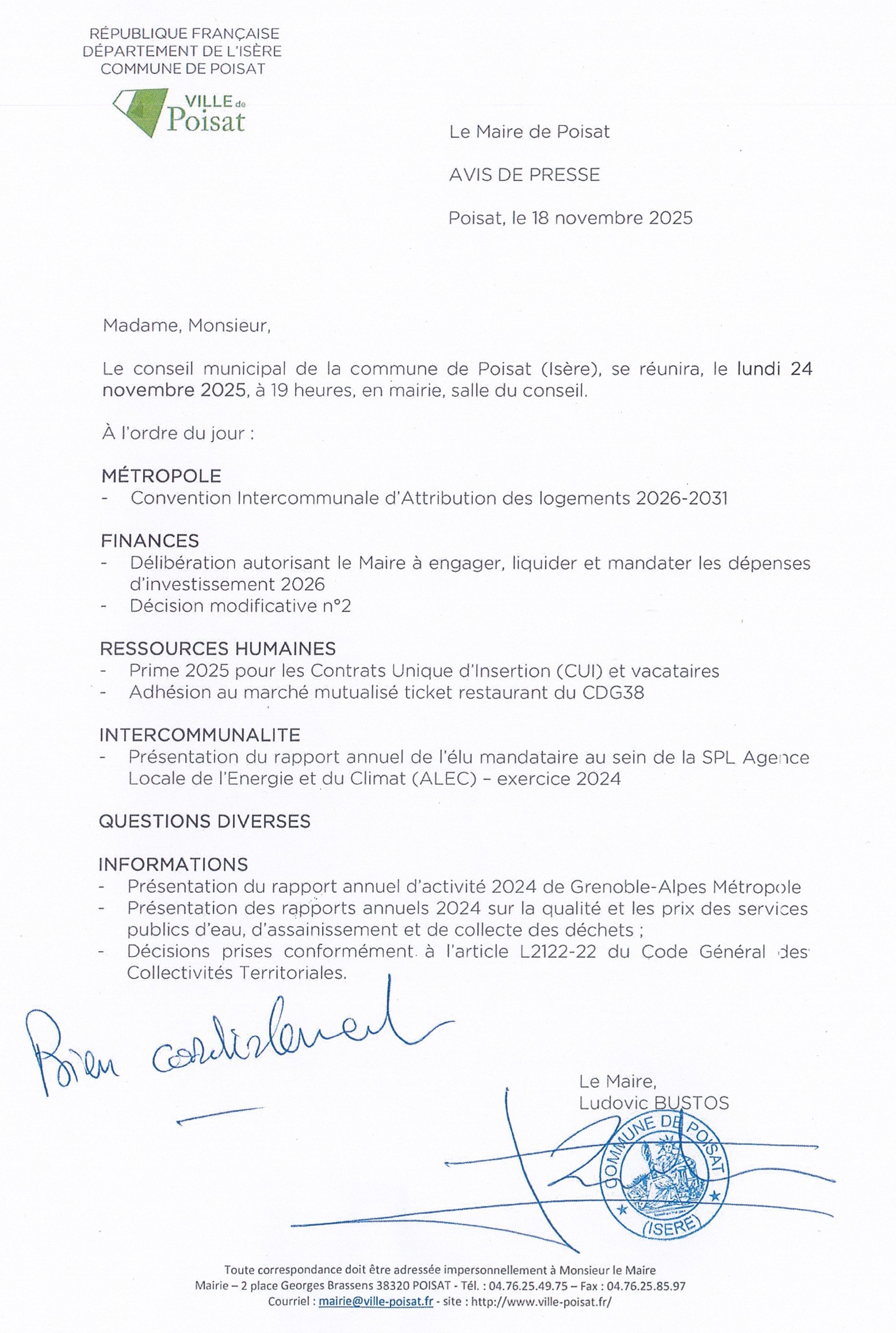 Conseil municipal – Lundi 24 novembre – 19 h – En mairie