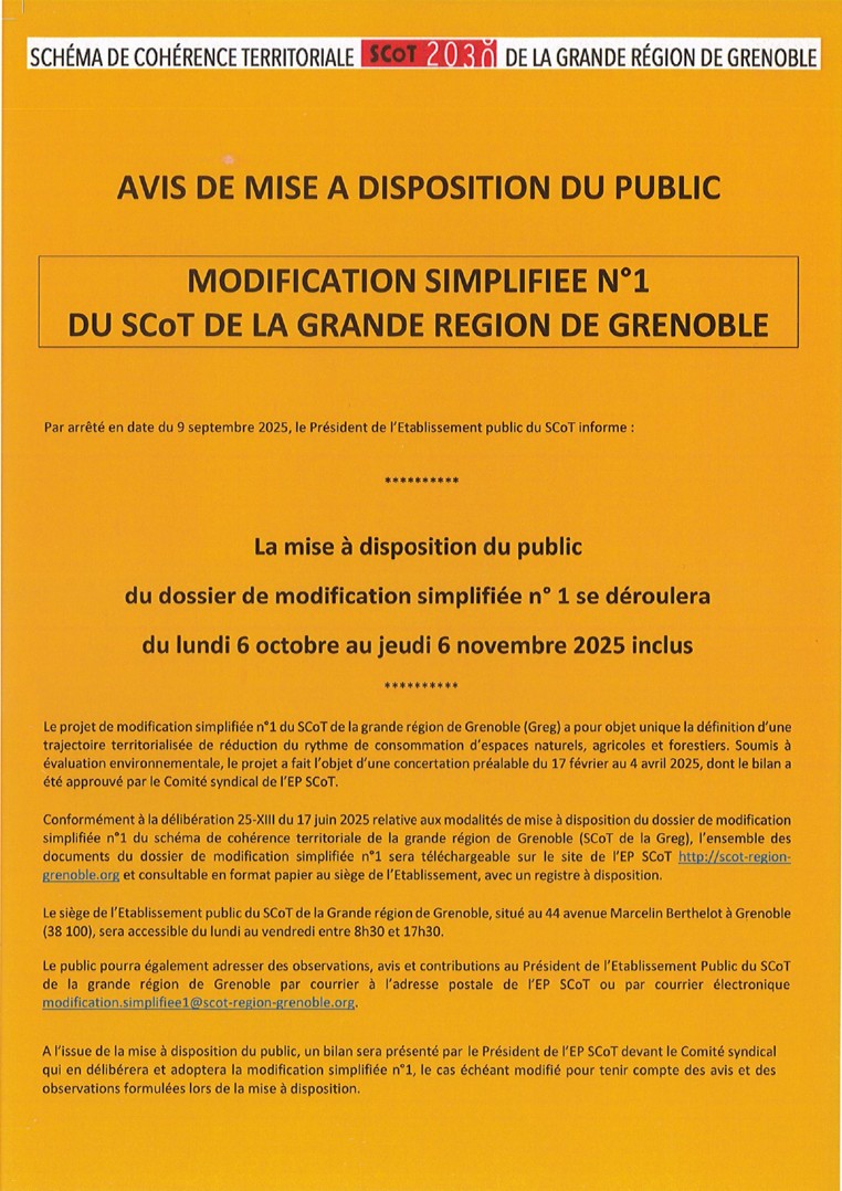 Retour Avis de mise à disposition du public de la modification simplifiée n° 1 du SCoT de la grande région de Grenoble – Du lundi 6 octobre au jeudi 6 novembre inclus Télécharger le dossier de la modification simplifiée n° 1 du SCoT de la région de Grenoble
