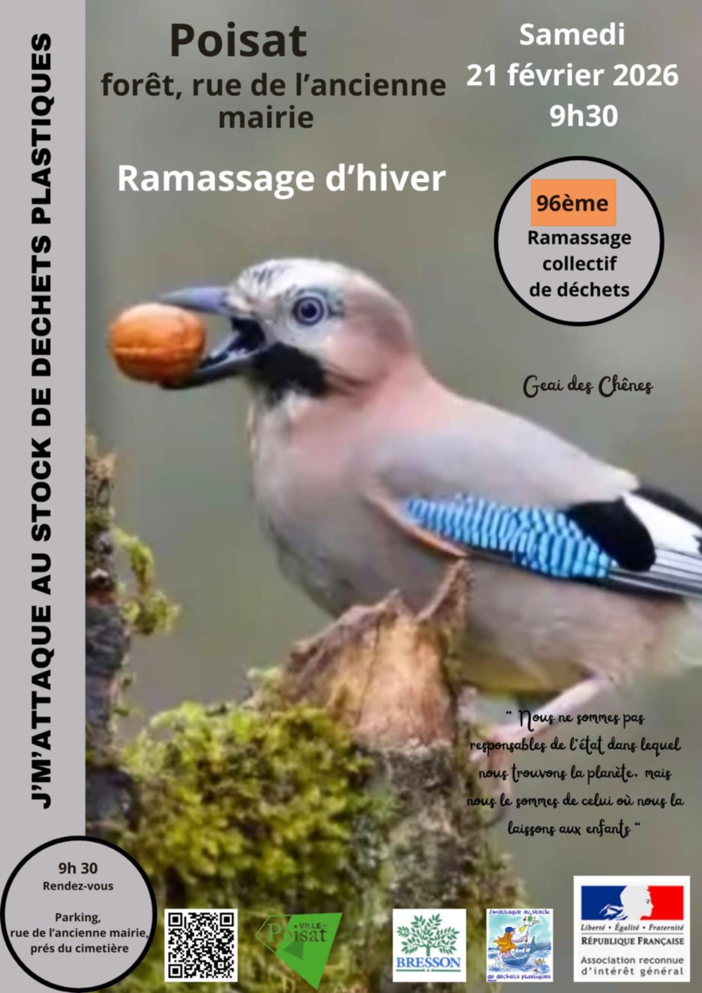L’association « J’m’attaque aux stocks de déchets plastiques » organise le 96e ramassage collectif de déchets à Poisat, en partenariat avec la ville de Bresson.